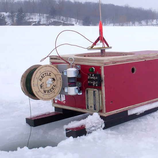 The perfect solution for us ULTRA LAZY ice-fishing rednecks who are too preoccupied “gettin’er done” to sit around and wait for a bite. Instead, we can go back to the warm of the old 1976 dodge pickup with the busted rear window and heat that doesn’t work anymore to sing along with Hank Sr; or go light some farts on fire; or even take the truck out for some donuts on the ice for a while! This alarm will shoot a rocket into the air when it’s time to actually start fishing, cuz as we all know the only two things that catch a rednecks attention are fast blurry things (Nascar) and boars (wife)….im not really sure where this one fits in, as im sure at least one of them would try to fuck it. That aside Holy shitballs, this thing is neat! I mean look at the thing, it’s a BEAST! It’s huge, and painted Craftsman Red! I bet if we hooked it up to a potato gun, we could make the fish shoot Billy Bob!