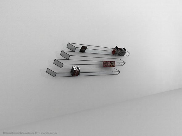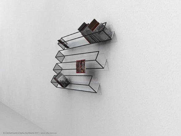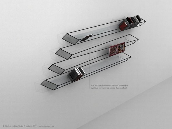 I dont read, I find it too hurtful to my brain spot, but I do like bookshelves that are kick ass! This one is supposed to be an illusion that makes you all flippity ploppity in the eyes, but I just think its looks like a magnet for books(which would totally be an awesome groundbreaking invention). The bookshelf is by artist John Leung who also made something called the parallel time clock or something silly like that. I like to trip people out when they walk into my place, so this would go perfectly with my trippy carpeting and endless circle fridge. there are more pics after the jump to show you how the illusion is done.