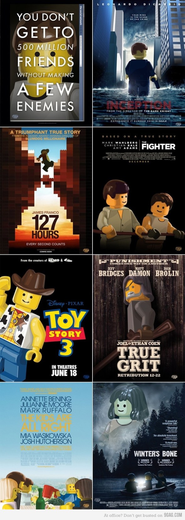 Im a little behind on this one, but it got lost in the trash after my dog ate it. This here is art, and not just any art…its Lego art! This is what it would have looked like if Lego people starred in the oscar nominated movies that we all love and worship. Hit the jumps for a whole toy chest full more. Oh and I used to make my Legos worship me as a god when I was a kid…anybody else to that? I had a Lego throne and everything.