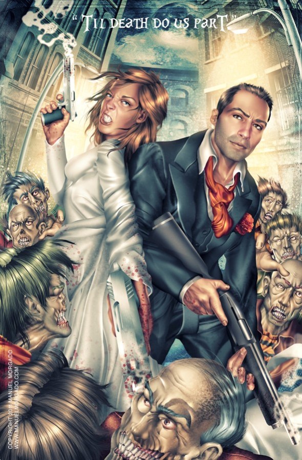 This here is a wedding invitation done by a professional, a profession zombie killer(and wife). This is how my wedding would be, cuz the undead hate me for killing so many of them with my weapons of mass destruction (read:fists). My wife would be 40 times hotter to and carry huge weapons of mass distraction (read: tits) and totally be a billionaire. Yep…thats the world I live in every day, you’re welcome.