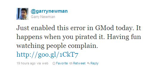 Garry Newman, owner of the Half-life 2 mod Garry’s mod and all around dick, has enabled an error message that only appears in pirated versions of the game. The gist of things is that an upgrade hid a program that could check if you were running a pirated version of the game, if so it would bring up an error “Unable to shade polygon normals”. This made hordes of (illegal) users flood into official forums complaining of the confusing error. Anyone who did exactly that had their Steam ID recorded and was then permanently banned. The trick was very ingenious if not only assholish to the max level. Garry Put all this together to fight back and have a bit of fun, stating that “you can’t stop pirates.. but you can troll them”. He has been watching all his accounts light up with complaints and smiling at all the banned players. So yeah he is a douche bag…but a totally justified one at that. Lets face it people stole his property and he got revenge, and in a clever way at that, You can’t tell me you wouldn’t have done the same.