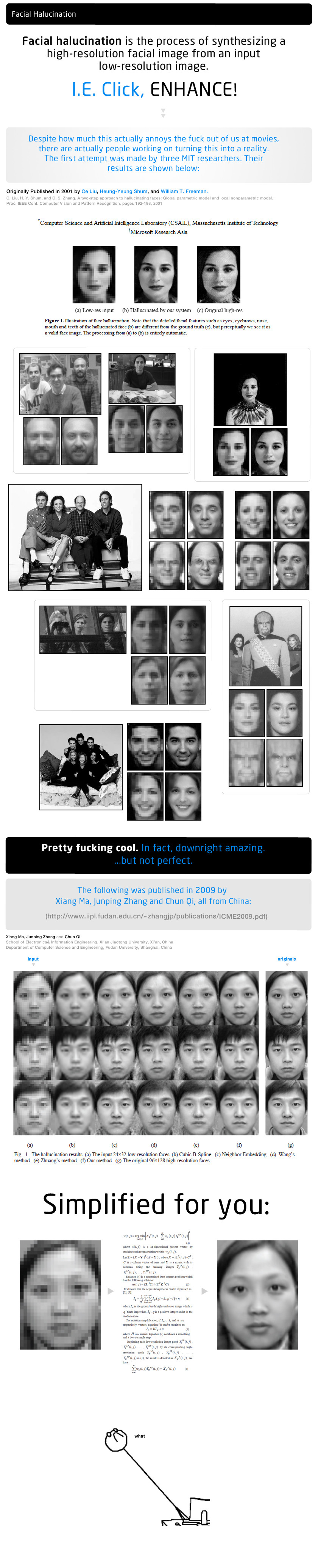I gots you what is closest to an infograph about some new tech that takes low res facial pictures and makes them high res. Now just put the hand cream back because I meant a picture of faces. Think back to all those annoying movie moments where a computer takes a pixelated picture of a perps and scans/process it to a normal mugshot, well now that is a reality apparently, I didn’t really do much research on this but it’s here for you to read now and you love it.