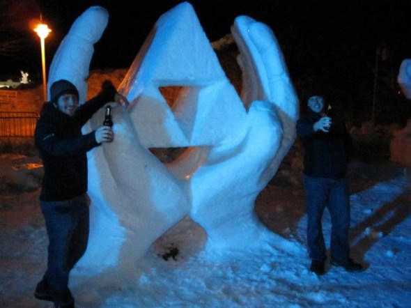 In an obvious attempt to impress me, These two lads got together and put into motion a borderline ingenious plan to become the coolest punks in all of Snowville….drinkin beers while leaning on some poor bastards sculpture. All jokes aside (besides the ones I use), the icy Zelda tribute is pretty impressive. The beer was probably just to help them stay warm as they didn’t have any girlfriends(I had them…I had them…) to tell them to stay the hell inside…or an ocarina to change it to day time.