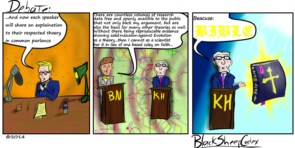 So I’ve had this one sitting around for a bit now…but I finally got around to putting words to it. Now I’m sure this isn’t going to sit well with a number of people…there are two things that are guaranteed to bring the worst of a conversation…and that would be poking fun at Politics and/or Religion, the debate happened to be covering both. Now I don’t care what you believe in….and I mean that I don’t care…and so long as you keep it to yourself I see no problem with an easy-going and mutually respectable society. Then there is the issue of the future generation, what to teach them…how to guide them to expand our civilizations knowledge and therefore the level of comfort we are able to enjoy (forget lengthening our term to live on the planet). Now I watched this debate hoping to be washed over with intelligent facts and maybe even opening my horizons to ideas I hadn’t yet considered…..these were two scientists after all…not just regular speakers. For the first 40 minutes of the program it seemed like it was going to be a very interesting debate: good points brought on by both sides and interesting questions directed at the other. But once it got down to the nitty gritty I was disappointed in the response from the creationist side of things. Now a closed mind is never a good way to approach any item that is unknown or questionable….and while Bill Nye did his best to bring forth parallel knowledge/studies to back his side, Ken Ham did essentially nothing but repeat himself and add in “because of the magic of God” (paraphrased of course). Now like I said I don’t care what you believe…but if you’re going to try to prove that creationism is a viable education for up and coming scientist than the results of one book versus thousands, snarkily footnoted with “because God” isn’t going to cut it. It is important that we continue to progress in the sciences, and until there is more proof to show that creationism is anything less than religion belief…I suggest we keep it out of our centers for learning.
