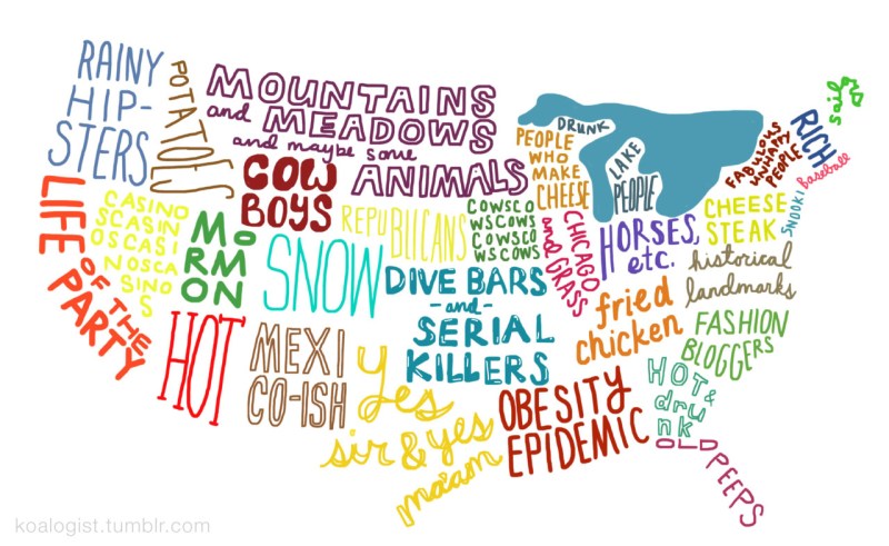 *see full size HERE* This here’s a map of th US with each local colored in with that particular setting’s most thought of stereotype. It’s by Haley Nahman and only has two…