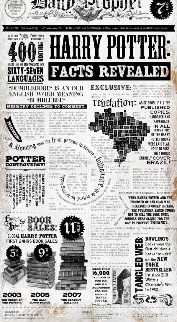 *click HERE for full size, readable version* This is a pretty neat, if hard to read infographic on the harry potter series. It’s designed after one of them magic news…
